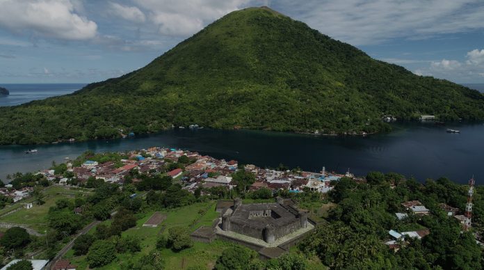 Kota kecil Banda Neira, berlatar Laut Banda dan Gunung Api – Sumber : kebudayaan.kemdikbud.go.id