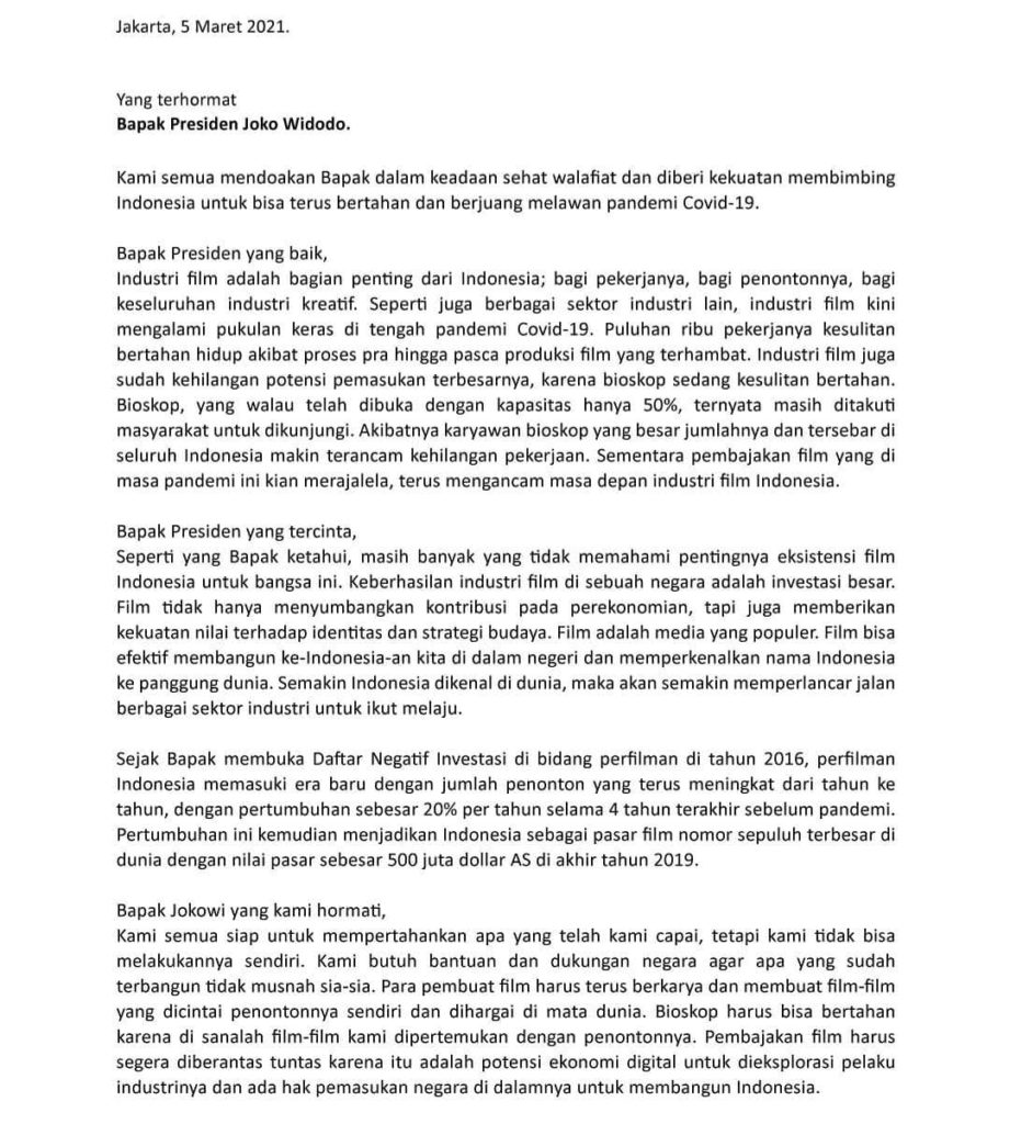 Meskipun demikian, kita harus tetap berupaya untuk keluar dari krisis ini. Bioskop memang sudah diperbolehkan beroperasi dengan kapasitas 50% namun banyak masyarakat yang masih takut pergi ke bioskop. Maka atas kesulitan dan keterpurukan yang dialami industry film Indonesia beberapa waktu belakangan ini para sineas tanah air beserta actor-aktris menyampaikan surat terbuka yang dibagikan melalui sosial media kepada Bapak Joko widodo. Dalam surat tersebut para insan film Indonesia meminta bantuan dan dukungan kepada pemerintah berupa berbagai paket stimulus, subsidi, serta perlindungan hukum dan kesehatan untuk seluruh sineas Indonesia agar mereka dapat terus berkarya dan bertahan untuk industry perfiliman kita yang telah berkembang pesat belakangan ini, bahkan pasar film kita telah tumbuh dan berada dalam daftar sepuluh pasar film terbesar di dunia. Semoga dengan adanya surat terbuka ini kita bisa mendapatkan solusi atas kesulitan yang sedang terjadi dan merayakan hari film nasional dengan sukacita. Selamat merayakan hari film nasional yang ke-71, tetap bertahan, tetap tumbuh, dan terus berkarya.